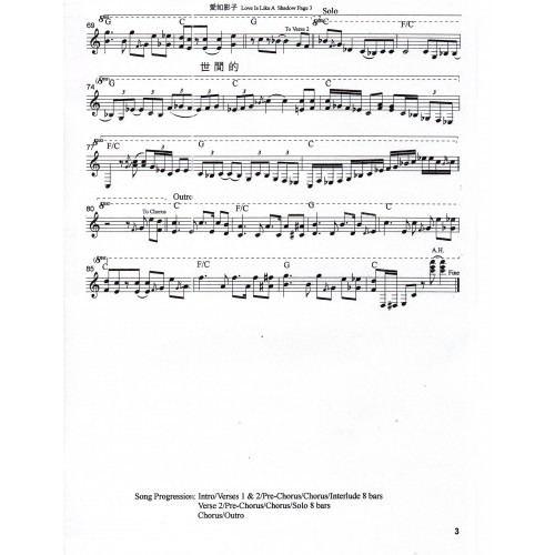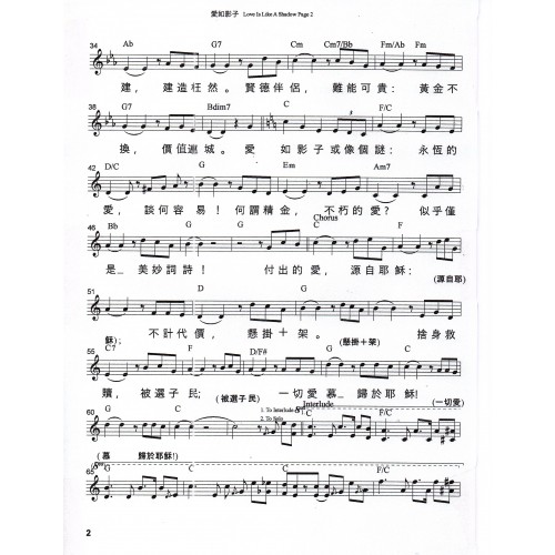 Description 爱如影子歌譜 Love Is Like A Shadow by Mizz Liu & Swing Ng Songsheets 人間真爱难求, 許多承諾和反悔: 曾轟烈过, 至淚灑乾: 夢幻泡影, 埋在記憶底. do-ba-do-ba-do-ba ha-ha 世間的爱, 情義遷移; 問誰幾可春風得意? 風花雪月, 形影不离; 決擇猶疑, 嫁娶無期 建屋沙上, 根基不穩; 神若不建, 建造枉然. 賢德伴侶, 难能可貴: 黃金不換, 價值连城. 何謂精金, 不朽的爱? 似乎僅是美妙詞詩! 付出的爱源自耶稣, 不計代價懸掛十架. 捨身救贖被選子民; 一切爱慕歸於耶稣!