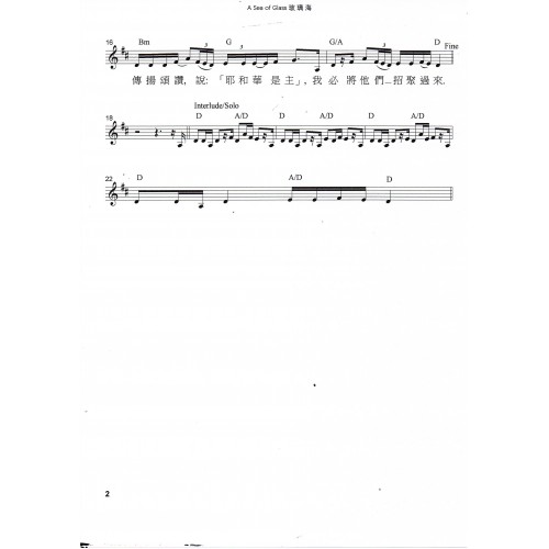 玻璃海歌譜 A Sea of Glass by Mizz Liu & Swing Ng Songsheets 在末後的日子里, 人要自發地寻求神. 從各国各族各家, 耒自东南西北方. 当智識充滿遍地, 信主的像玻璃海. 此情此景豈不是 已記載於啓示錄. 玻璃海! 噢, 玻璃海! 因有神荣光照耀 認識耶和华的人 猶如水充滿海洋! 我们当为雅各欢樂歌唱 因萬国中为首的欢呼拍掌 当傳揚頌赞說: 耶和华是主 "我必将他们招聚过来"